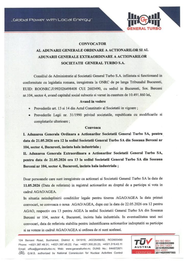 CONVOCATOR AL ADUNARII GENERALE ORDINARE A ACTIONARILOR SI AL ADUNARII GENERALE EXTRAORDINARE A ACTIONARILOR SOCIETATII GENERAL TURBO S.A. 21.05.2026 ora 12
